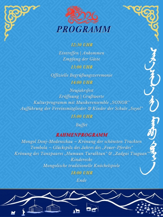 Unser Verein hat es sich zum Ziel gesetzt, das mongolische, deutsch -mongolische Zusammenleben in Deutschland zu verbessern. Zwecke unseres Vereins sind